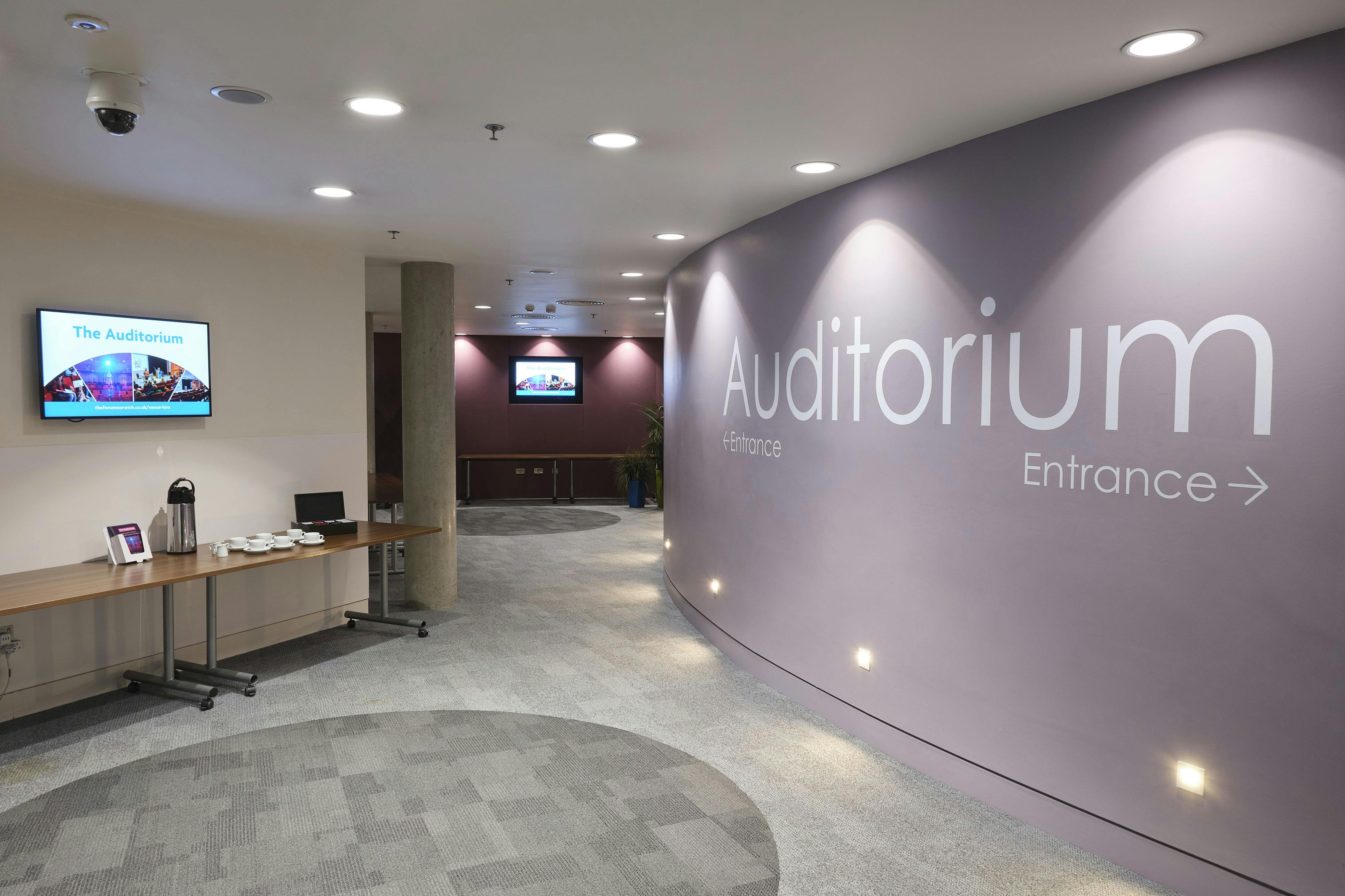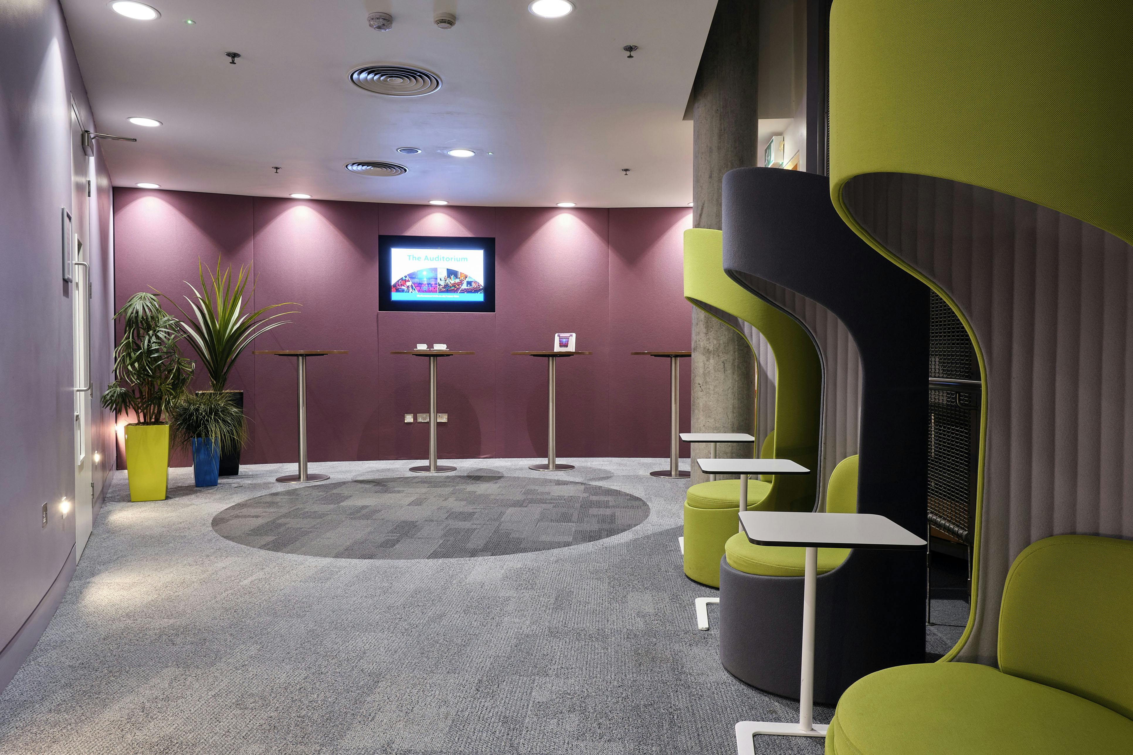The Auditorium includes a lobby area providing room for refreshments and networking, perfect for up to 70 people. If you wish to have a larger breakout area, then you can book The Gallery in conjunction. Our Venue Hire team can help you arrange catering and teas and coffees. The lobby includes dedicated plasma screens which can be programmed with your own branded content.
